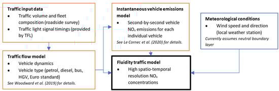 Computational Fluid Dynamics (CFD) large eddy simulation (LES) models are able to simulate urban airflows and the corresponding dispersion of emissions at high temporal and spatial resolution. As computer technology improves, LES is increasingly used for urban dispersion problems, for example [,,,]. LES simulations can be used in conjunction with other, less resource intensive models using a multiscale approach where the use of LES is limited to a small area of particular interest, for example [,]. By resolving the fine flow structures within the street, LES models are able to provide high resolution concentration fields of harmful pollutants down to length scales in the order of < 1 m and timescales < 1 s. These models can therefore be used to investigate how representative longer term mean concentration estimates are of the actual second-by-second exposure experienced by pedestrians. Fluidity is a multipurpose open source LES code with mesh adaptivity technology. Here we use the mesh adaptivity capability to automatically refine the computational mesh in the vicinity of building surfaces, where a higher degree of refinement is required to accurately capture the near surface airflow. A traffic module was developed allowing Fluidity to simulate the impact of moving vehicles on the street-level airflow and their effect on the dispersion of tailpipe emissions, represented as volume sources []. Here the Fluidity traffic model is used to simulate moving vehicle tailpipe emissions only, emitting NOx at time-varying emission rates. The traffic flow model is used to simulate the vehicle dynamics as they travel along the road, and an instantaneous emissions model representative of the current UK traffic fleet is used to simulate the emission rates []. Each vehicle tailpipe is discretely represented and we define the length of the volume source as a function of the vehicle velocity in order to ensure a smooth and continuous release as the vehicle moves along the street. This provides a high spatial and temporal resolution model of the dispersion of NOx emissions along a road in London. A similar approach was used using Reynolds-Averaged Navier–Stokes (RANS) CFD in [,] where traffic flow simulators were coupled to an instantaneous emissions model and used to generate time varying emissions for segments along the road. These examples achieve a high spatial resolution of both traffic emissions (down to a few metres) and pollutant concentrations, however the use of RANS means that concentration fluctuations are not captured at high time resolution unless an additional concentration fluctuations equation is solved. Other examples of CFD studies of urban air quality at the microscale typically use hourly averaged emissions, released using a constant line source along each road, e.g., [,,,]. To the authors’ knowledge, up until now there is no example of a high resolution traffic emissions model coupled with LES, providing pollutant concentration fluxes within the street at a time resolution in the order of 1 s.