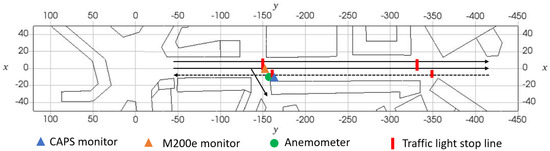 The sensors used during the field study that provided the data and used to compare with the LES were a M200E Chemiluminescence analyser by Teledyne Instruments [], measuring NOx and NO2 at a 1 min resolution, and a Serinus 60 NO analyser using cavity attenuated phase shift spectroscopy (CAPS) to measure NO2 at a 1 s resolution (the rise and fall time of this instrument is 30 s) []. The locations of these sensors are shown in Figure 3. A background subtraction has been applied to the measured values shown in this paper unless stated otherwise. The background subtraction assumes a value for the “background” signal (i.e., concentrations emanating from other sources away from the road) equal to the minimum measured concentration over a rolling 4 min window. This method is similar to that used by [] for a network of sensors, however here is only applied to a single sensor. The restriction of only one sensor of course limits the utility of this method, however sensitivity studies and comparisons with nearby reference background measurements revealed that the method was sufficient for its purpose. The result is an approximation of the concentration signal due to the emissions from the road only.