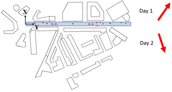 A snapshot of moving vehicle sources (red) and volume source (blue) along London Road. The coordinate system, with Z vertical, is also shown. The prevailing wind direction for both days is indicated by the red arrows.