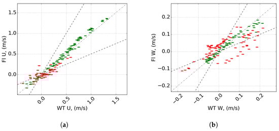 Scatter plots of (a) u and (b) w for the wind tunnel and LES. Green markers indicate values which meet the criteria, red markers indicate values which do not meet the criteria. Dotted line is the x = y line, dashed lines are the factor 2 lines.