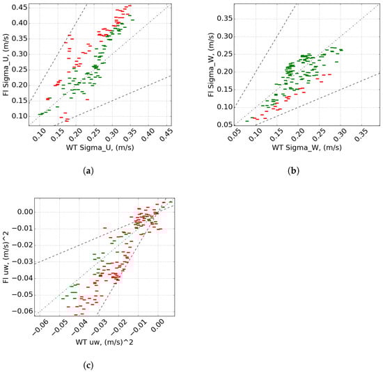Scatter plots of (a) , (b) and (c) for the wind tunnel and LES. Green markers indicate values which meet the criteria, red markers indicate values which do not meet the criteria. Dotted line is the x = y line, dashed lines are the factor 2 lines.