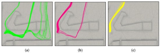 Mean streamlines from the source area: (a) the location in the wind tunnel denoted by , such that ; (b) the location is shifted by 10 mm m); (c) the location is shifted by 20 mm m). The height, Z = mm, is the same for each case.
