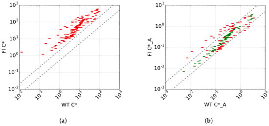 Scatter plots of (a) and (b) for the wind tunnel and LES. Green markers indicate values which meet the criteria, red markers indicate values which do not meet the criteria. Dotted line is the x = y line, dashed lines are the factor 2 lines.