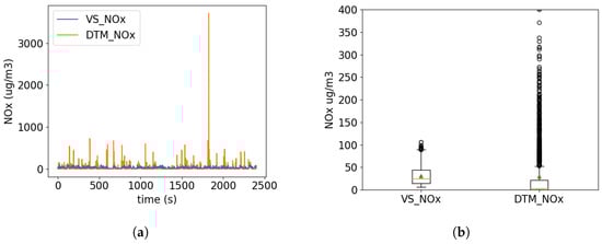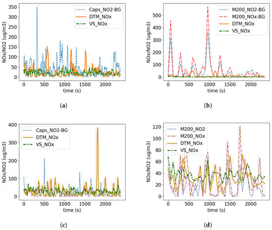 There is a strong correlation between the NOx and NO2 concentrations measured by the M200e sensor, allowing a qualitative comparison of the modelled NOx and measured NO2. The DTM and measured CAPS concentrations behave in a similar way, with both displaying semi-regular concentration peaks approximately 60 s apart, which is in the order of the time period of the traffic lights. These peaks are generated both by the idling engines of queuing vehicles and the spike in emission rates seen on acceleration when the light turns green (e.g., see [,]). The VS concentrations show much less variability as expected, but are not constant, despite a constant emission rate, due to the street-level turbulence.