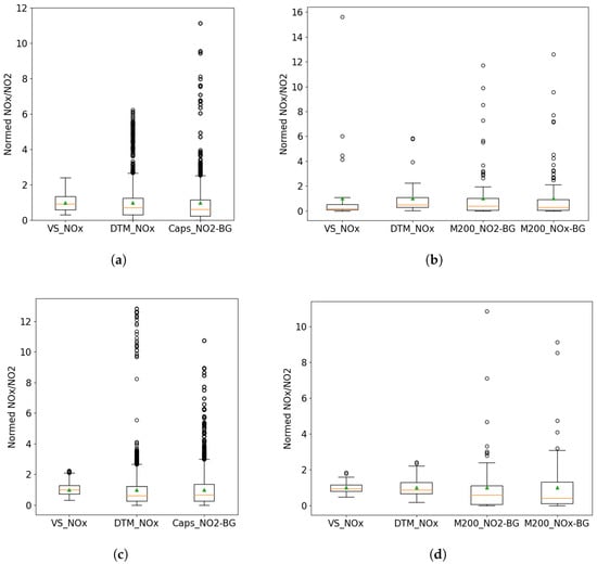 Comparison of measured and modelled box plots. (a) Day 1 CAPS (30 s rolling average), (b) Day 1 M200e (60 s average), (c) Day 2 CAPS (30 s rolling average), (d) Day 2 M200e (60 s average). The green triangle indicates the mean, the orange line the median and the whiskers extend the inter-quartile range. An approximation of the background concentration has been subtracted from the measured NO2 data.