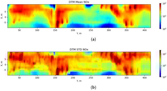 Finally, Figure 12 shows a map of the time averaged mean and standard deviation of 1 s resolution concentrations along the road for Day 2. Mean concentration hotpots can be seen near the junction (Y = m) and pedestrian crossing (Y = m) where vehicles are required to stop then accelerate from standstill. These locations also correspond to where pedestrians are likely to wait to cross the road. The standard deviation map shows that the variation in concentration is often of the same order or greater than the mean. The standard deviation is also greater for a larger proportion of the road, demonstrating that while mean concentrations are much lower away from the junction and pedestrian crossing hotspots, peak concentrations occur along the entire length of the road. This behaviour was not captured by the VS representation of the traffic emissions.