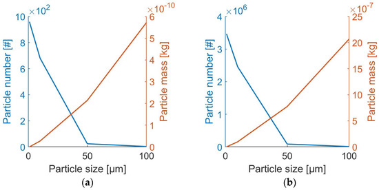 In order to obtain a more general statement about the size distribution of the entire filter, the arithmetic mean was formed over all recorded image sections. As the size distribution evaluated in this way only referred to a small area (averaged over 3 images with an area of 800 × 600 µm²) of the filter, the averaged particle size distribution (PSD) was extrapolated to the entire filter pad size. The filter pad was circular, with a diameter of 47 mm. Relating the total area to the area under consideration resulted in a factor of approximately 3614, which then had to be multiplied by the size distribution. Here in Figure 3 is shown, that the size distribution changed only quantitatively and not qualitatively.