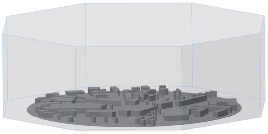 A suitable model then had to be built as a simulation. To this end, a CAD (computer-aided design) model of the object to be considered was created, which was then transferred into a CFD (computational fluid dynamics) model by integrating a flow body, subtracting the solid CAD model. To take into account the main and intermediate wind directions, the fluid body was modelled as an octagon. This made it possible to simulate wind from several directions. The main traffic intersection at the university location, Ilmenau (Thuringia, Germany), was chosen as the starting point for the model, and a corresponding CAD model with a diameter of 500 m was simulated, as can be seen in Figure 4. Due to the shopping mall in the vicinity, and the high traffic volume, the influence and impact of particulate emissions or swirls was considered most critical here. In the modelling, simplifications had to be made, with regard to building geometries and the representation of objects, such as trees and streets. Furthermore, an exact modelling of the object height was not applicable, as this information was not available, and the high level of detail would have affected the robustness of the simulation. The height would have had to be measured by hand, or estimated for each object itself. Due to this fact, a uniform object height of 14 m was defined for all modelled objects, and the buildings were modelled as a polygon with a flat top, as shown in Figure 4.