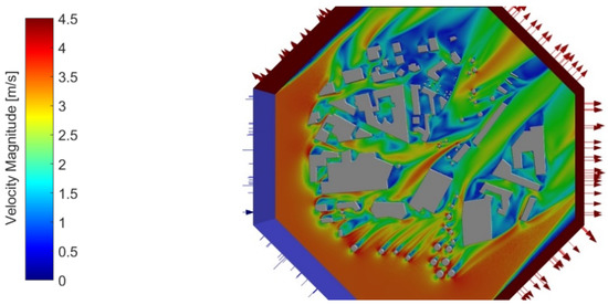 The wind direction and wind speed were obtained from external weather data, and integrated into the simulation. Thus, the simulation was carried out with south–west wind, with an average annual flow velocity of 15 km/h (corresponding to about 4 m/s). The injection of the particles was carried out in two different ways in these investigations: firstly, injection was carried out aerially on the intersection, to study the dispersion of emissions when vehicles accelerated on the intersection; secondly, injection was carried out along the major and minor roads, to assess the dispersion and impact on the immediate vicinity of the road. In addition, the study of particle pollution was also conducted at different height positions. This was because not only adults (at a height of 1.5 to 2 m) are affected by emissions, but also children and pets much closer to the ground, where particle concentrations may be even higher. The particles were launched into the calculated flow field without initial velocity. The reason for this was that vehicles passed the intersection or traffic roads from different directions, and thus no uniform emission trajectory could be defined.
