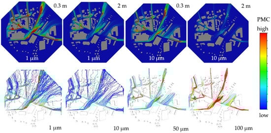Particle dispersion after injection on the roadways. Above: particle trajectories according to the viewing height coloured by PMC (particle mass concentration). Below: particle trajectories according to the particle size coloured by PMC.
