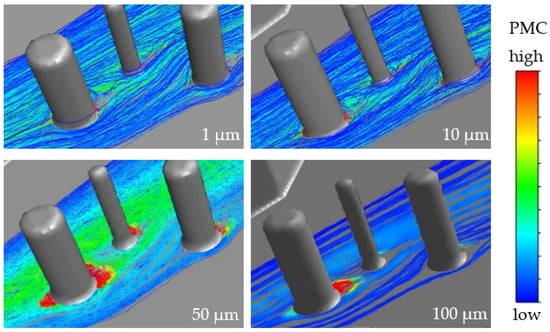 Here, too, larger particles sank with increasing distance from the injection site, so that particle dispersion decreased. Because of the higher particle density—due to the concentrated injection of the same number of particles—the areas of accumulation and the dead water areas were also clearly visible here. Both upstream and downstream of the obstacles, areas of low flow velocity were formed where the particle concentration was very high (see Figure 7) and particles were consequently deposited.