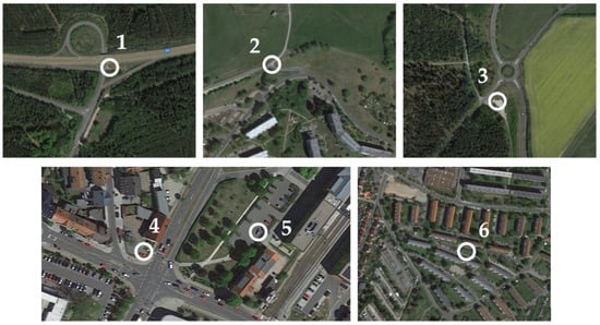 Six different measurement positions were defined for the measurements: (1) in the alignment of a motorway exit; (2) somewhat rural location (free-flowing air masses, low traffic volume, background pollution); (3) near a roundabout; (4) at the main traffic intersection; (5) near the main traffic intersection at the railway station (comparison with simulation); (6) in a residential area. Figure 8 shows the measurement positions on a map. The evaluation of the different measurement positions clearly showed the influence of the high traffic volume, and thus the increased particle pollution by vehicles.