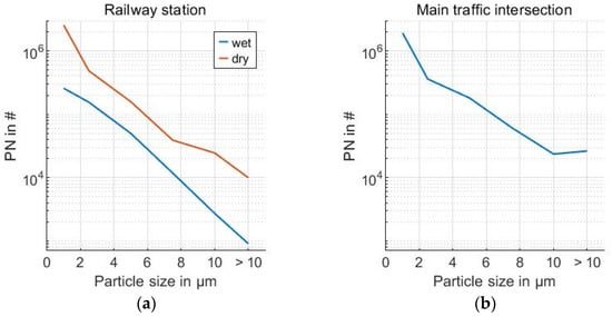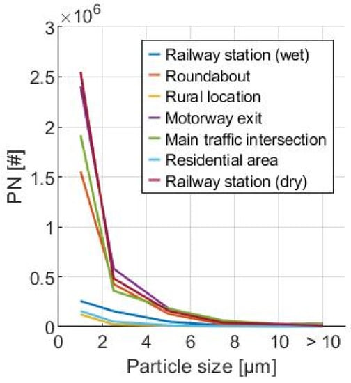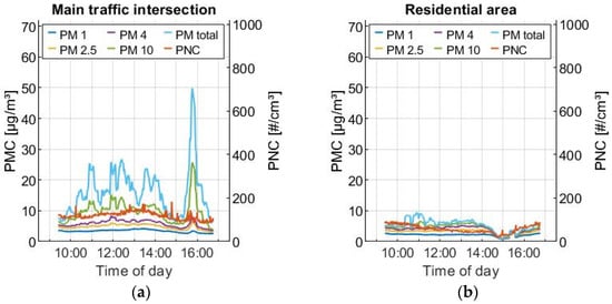 Comparing the measured values of the main traffic intersection—where the measuring station was positioned directly behind the pavement—with those in the residential area—where the measuring station was located at the roadside between the residential buildings—a clearly increased PNC (particle number concentration) and PMC, due to a high traffic volume, was detected, as shown in Figure 9.