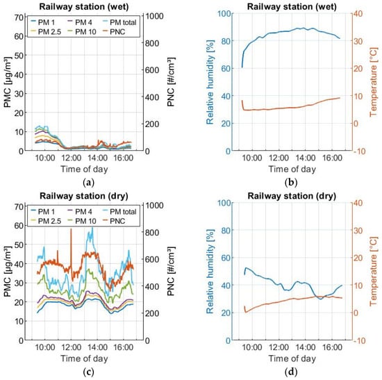 Comparison of the influence of air humidity on PMC and PNC: (a,b) influence of high humidity; (c,d) influence of low humidity.
