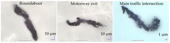 As noted above, the loaded filters of the measuring station were collected after the measuring days, and then analysed under a digital microscope. As it was very difficult to classify the particles unambiguously by optical observation, it was only possible to draw conclusions about the presumed emission sources of some particles. Nevertheless, this analysis showed a varying occurrence of different particles at the measurement positions, in that certain surfaces, structures and colours allowed an approximate classification. For example, a higher particle density of large tyre particles, which characteristically have an elongated, bead-like shape, could be seen on roads with heavy traffic, or at measuring positions with high vehicle dynamics. Furthermore, particles of road salt or sand could be detected in the tyre particles. Examples of this are shown in Figure 11.