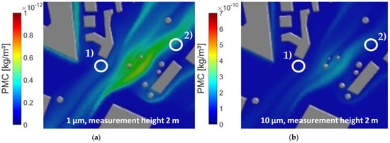 Simulated PMC of (1) main traffic intersection and (2) railway station for: (a) 1 µm particles; (b) 10 µm particles.