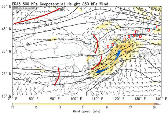 500 hPa height field (black isoline, brown line is trough line) and 850 hPa wind field at 08:00 on 18 November, the blue arrow line is 850 hPa jet core, “D” is the center of ground low pressure every 6 h from 08:00 on 18 November to 08:00 on 20 November.