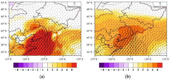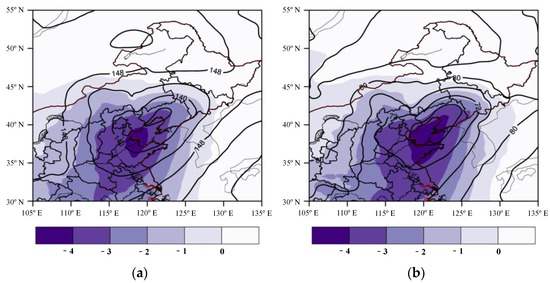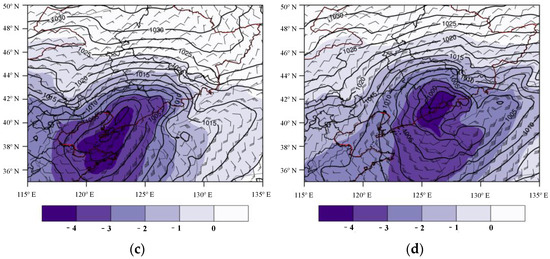 The standardized abnormality of the height field and sea-level air pressure fields were analyzed. At 20:00 on the 18th, 850 hPa, 925 hPa, and ground pressure fields showed significant negative abnormalities from Liaoning to the south of Jilin, reaching −2 σ to −4 σ (Figure 3a–c), and from 08 to −4 σ in the pressure near the ground cyclone center on the 18th to nearly 24 h (Figure 3d). In addition, the ground cyclone rapidly dropped to 997.5 hPa, with a central pressure, from 1005 hPa within 24 h before and after passing through the Bohai Sea. The unusual bias strength of low-layer low vortex and ground cyclones, and the rapid enhancement of ground cyclones both provide favorable conditions for the rising motion.