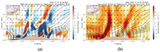 (a) equivalent temperature (contour), divergence (color) and profile wind at 02:00 on 19 November, (b) equivalent temperature (contour), absolute vorticity (color) and profile wind at 02:00 on 19 November.