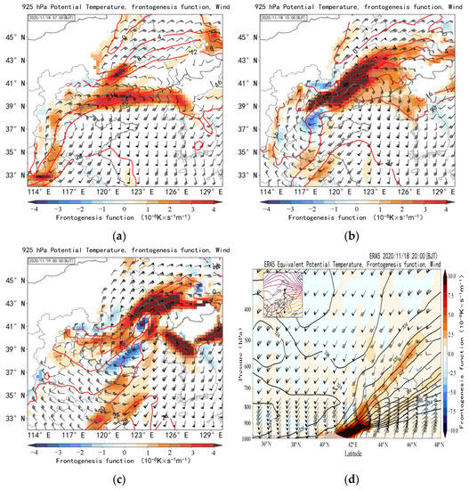 The vertical distribution of frontogenesis functions showed that the frontogenesis zone was mainly located below 925 hPa. According to the 925 hPa frontogenesis function, there were two obvious frontogenesis areas at 07:00 (Figure 5a), and the precipitation was mainly located in the southern frontogenesis area. The two areas then gradually approached and merged in western Liaoning (Figure 5b) at night on the 18th, and the frontal intensity gradually developed to the northeast. At 00:00 (Figure 5c), the frontogenesis area was located in the north of Liaoning, then continued to move to the northeast, the intensity gradually weakened, and the precipitation also gradually weakened. The temperature profile of 123° E also shows the characteristics of the merger and strengthening, and the frontal development is mainly located below 925 hPa (Figure 5d).