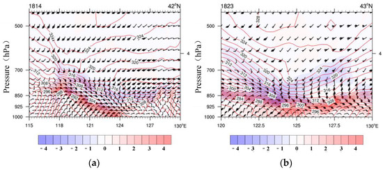 (a) the altitude and longitude profile of the false equivalent potential temperature (isoline), the second term of wet potential vorticity (color) and the wind field along 42° N at 14:00 on 18 November, (b) the altitude and longitude profile of the false equivalent potential temperature (isoline), the second term of wet potential vorticity (color) and the wind field along 43° N at 23:00 on 18 November.