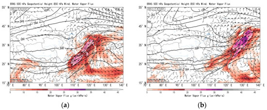 (a) 850 hPa water vapor flux (color) and wind field (arrow) at 08:00 on 18 November, (b) 850 hPa water vapor flux (color) and wind field (arrow) at 08:00 on 19 November.