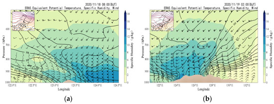 (a) the altitude and longitude profile of equivalent potential temperature (line), absolute humidity (coloring) and profile wind at 08:00 on 18 November, (b) the altitude and longitude profile of equivalent potential temperature (line), absolute humidity (coloring) and profile wind at 08:00 on 18 November (wind) at 02:00 on 19 November.