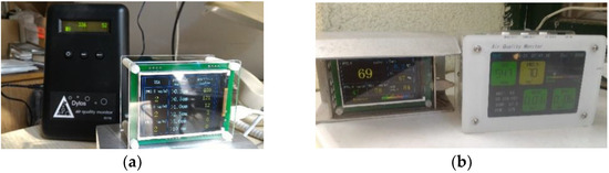 Pictures of the Dylos air quality monitor and a GPM sensor without housing at the background site (a) and a GPM sensor with aluminum housing next to a BH1 unit at the urban site (b).