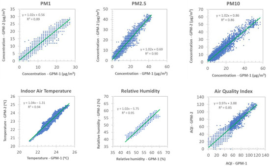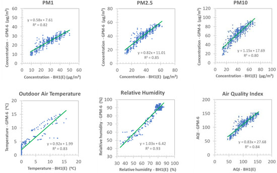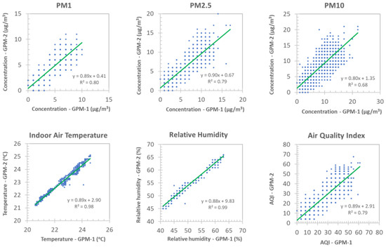 On the other hand, indoor air parameters such as Ta and RH showed less bias: 1.5% and 8.8% on average, due to their less fluctuations in the indoor air. Nevertheless, when looking at the correlation graphs of the two sensors (Figure 2), strong correlations can be found between the monitoring data for each PM species, and the indoor microclimate data as well. The R value of the linear fit ranged between 0.93 and 0.97. However, a broader spread for AQI values lower than ≈70 could be seen. A similar data pattern was experienced for low values of PM, but to a much lesser degree (Figure 2).