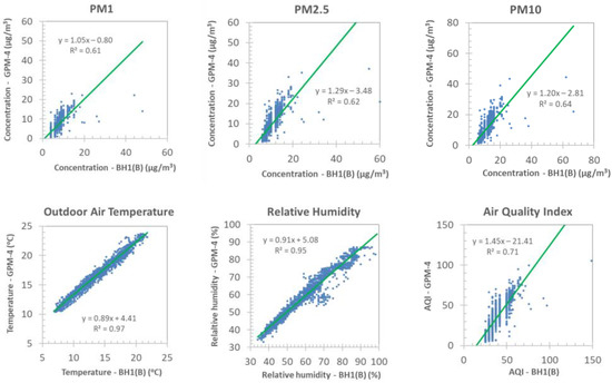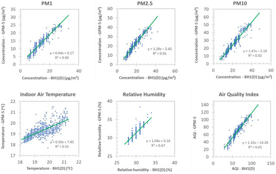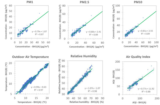 As it appears in Figure 4, the data series of the two BH1 sensors for PM1, PM2.5, and PM10 correlate strongly with R values of 0.93 or better. The intercepts of the linear fit of the equations for PM1, PM2.5, and PM10 were observed to be 1.87, 2.41, and 2.55 µg/m3, respectively, showing consistency in the readouts of the sensors. Similarly good correlations could be observed for the AQI datasets. The microclimatic parameters of Ta and RH demonstrated even better correlation with R values higher than 0.98.