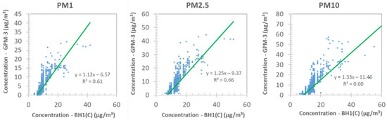 When scrutinizing the correlation graphs of the PM data recorded by the GPM and BH1 sensors (Figure 5), the correlation coefficients of the linear fits show that the two data series correlate rather well, with R values of 0.78, 0.81, and 0.78, respectively (p = 0 at 0.01 confidence level).