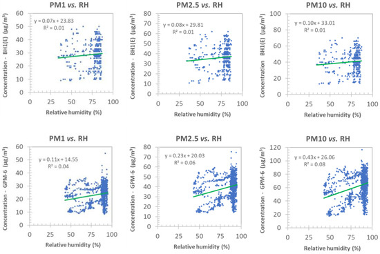 Effects of air relative humidity (RH) on PMx readings of BH1 (upper graphs) and GPM (lower graphs) sensors studied at the suburban site between 6 and 12 December 2021 (sampling rate: 1–5 min, n = 2018).