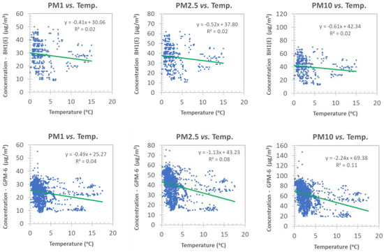 Besides the effects of RH, the influence of Ta on PMx readings of the LCSs were evaluated (Figure 10). As seen, the slopes of the linear fits for BH1 monitor ranged from −0.41 to −0.61 µg/m3 °C, while for the GPM they ranged between −0.49 and −2.24 µg/m3 °C, showing higher PM readings for low temperature values, e.g., below 5 °C. On the other hand, the intercepts of the equations ranged between 25 and 69 µg/m3, with increasing values towards the coarser PM fractions. The monitoring data from BH1 show insignificant correlation with the Ta changes, which is manifested in the low R values of about 0.14 for each PM fraction. On the other hand, the PM data obtained from the GPM sensor developed very weak dependency on varying Ta, which can be seen in the R values gradually increasing from 0.2 to 0.33 with increasing PM size fractions. Interestingly, a reverse trend for the dependency of PMx on changing Ta was observed for the spring period (data not shown here) as compared to the winter campaign.