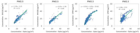For calibration purposes, the PM2.5 readings of the LCSs were plotted against those values observed with the assistance of Dylos reference monitor (Figure 11). As it appears, the calibration fit of each BH1 sensor is linear over the studied PM2.5 concentration range with calibration slopes of 0.92 and 1.1, respectively, and with low intercepts of −5.25 and −2.38, respectively. The correlation coefficients of these fits are also acceptable, with R values of 0.87 and 0.83, respectively, showing strong correlation between the dataset pairs. On the other hand, the PM2.5 data from the GPM monitor develop a rather second-order function, which is due to the deviation in the readings in the low concentration range, i.e., for values of lower than about 20 µg/m3. When excluding these data from the evaluation, it can be seen that the datasets can be approached well with a linear equation (slope: 1.08, intercept: −2.91). Overall, the GPM and BH1 sensors follow the PM2.5 readings of the reference monitor quite well. Consequently, these LCSs do not usually require calibrations against reference monitors, apart from the air pollution levels falling into the low PM range and when measuring ambient air under high RH conditions as noted above.