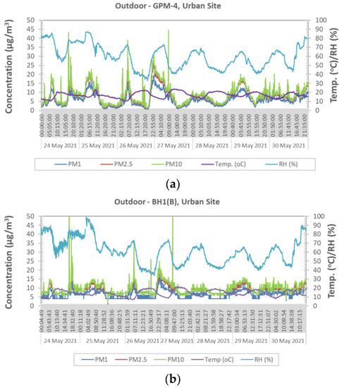 Temporal PM and microclimatic data series for (a) GPM and (b) BH1 monitors at the urban site, recorded between 24 and 30 May 2021 (sampling rate: 1–5 min, n = 2300).