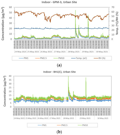 Temporal PM and microclimatic data series for GPM (a) and BH1 (b) monitors at the urban site, performed indoors (anteroom) between 24 and 30 May 2021 (sampling rate: 1–5 min, n = 2300).