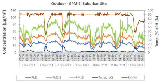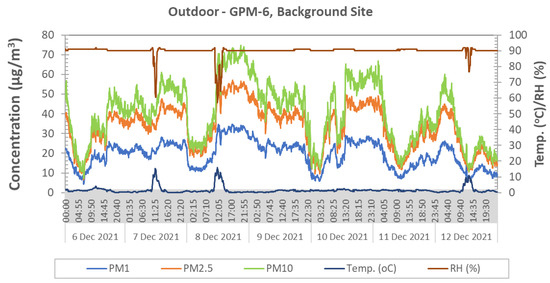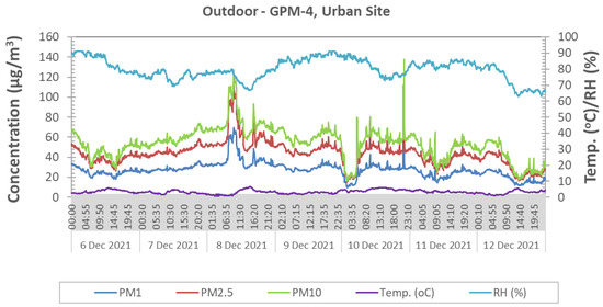 The temporal trends observed during the winter campaign (6–12 December 2021), with the application of the GPM sensor at the background site, outdoors, is depicted in Figure 15. As seen, elevated levels of PM1, PM2.5, and PM10 were experienced, reaching as high values as 30, 50, and 75 µg/m3, respectively. The enhanced PM background can be seen on weekdays, while on weekends, lower aerosol concentrations were obtained. Therefore, it is supposed that the emissions of the local heating station of the campus is a main source of this enhanced background PM levels. Moreover, during winter, several people living in residential houses of the nearby settlements apply wood-/coal-fueled heating for their homes. This type of anthropogenic emission can deteriorate the air quality at the concerned sampling site for each three PM fractions by enhancing the local background PM levels. Fairly high RH values of about 80–92% were observed at this sampling site with air temperatures as low as close to freezing. The AQI values for outdoor air of this site ranged between 28 and 152 (average: 97, median: 100).