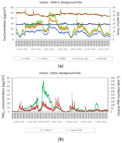 Temporal PM and microclimatic data for GPM (a) and Dylos (b) monitors at the background site, indoors (office room) between 6 and 12 December 2021 (sampling rate: 1–5 min, n = 2003).