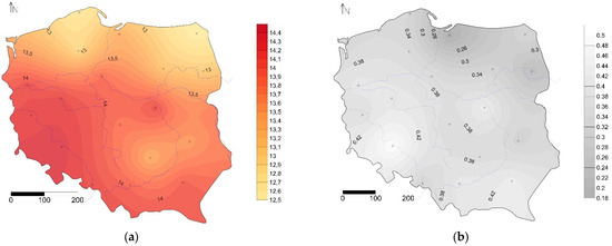 Mean temperature in Poland during the years 1966–2020 in the period from April to October was 13.6 °C. The spatial distribution of air temperature evidently reflects the effect of the central European continent on the territory of Poland. Mean annual values decreased from the southwest of the country toward the northeast (Figure 2a). The area of the Silesian Lowland is the warmest, with the highest mean value reaching 14.4 °C in Wrocław and Ziemia Lubuska (Zielona Góra and Gorzów Wlkp., 14.2 °C), and in the Wielkopolska Lowland (Poznań, 14.2 °C), and the lowest in the Suwalszczyzna region (Suwałki, 12.5 °C) and in the eastern part of the coast (Łeba, 12.6 °C). Mean temperature of more than 14.0 °C is characteristic of areas located along the Oder and Warta Rivers, the center of Poland, and a belt in the south of the country (Małopolska and Podkarpacie). The lowest mean temperature in the warm period is recorded in the northeast.