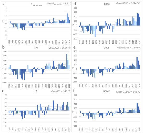 Long-term variability of the deviation from the average values of air temperature (April–October) and agroclimate indices in Poland (1966–2020). Explanation: (a) mean air temperature from April to May; (b) SAT; (c) LTI; (d) GDD0; (e) GDD5; (f) GDD10.
