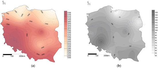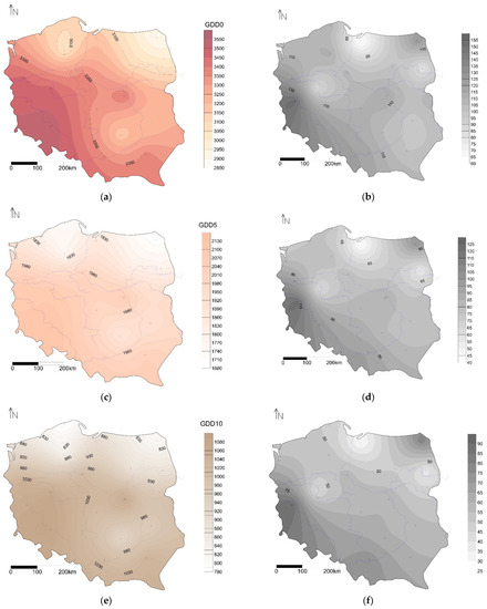 The spatial distribution of total GDD for all thresholds is similar, as reflected in the temperature distribution and effect of local conditions (Figure 5). An increase in thermal resources occurs from the southeast to the southwest of Poland. Smaller amounts of heat also reach the eastern part of Pomorze and the belt extending from central toward eastern Poland. The region of Warsaw is characterized by somewhat greater thermal resources.