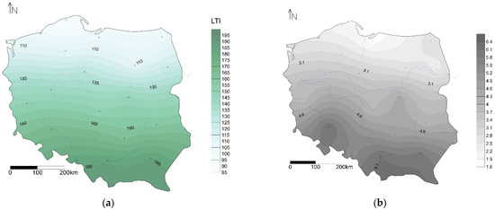 Spatial distribution of LTI (a) and changes during 10 years (b) in Poland (1966–2020).