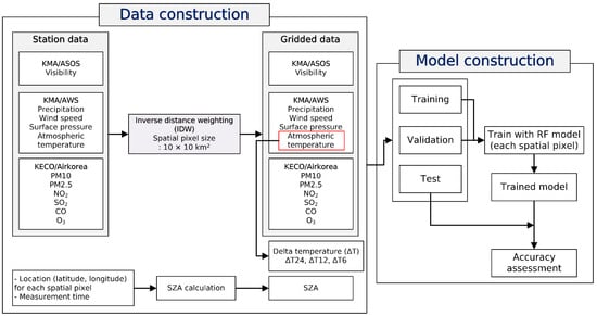 Visibility is directly predicted spatiotemporally using numerical weather prediction (NWP) models [1,10]. However, challenges resulting in poor performance have been reported in visibility prediction [11,12,13]. As an alternative, statistical techniques (machine learning and regression analysis) have been introduced to estimate visibility information: camera-based and sensor-based approaches [14]. Camera-based approaches have especially been actively suggested, mainly focusing on road conditions. RGB images are inputted to train machine learning models, such as neural networks [15], convolutional neural networks (CNNs) [16,17], generalized regression neural networks (GRNNs) [17], CNN-RNN [18,19], and Support Vector Regression [20,21,22]. However, these image-based visibility estimation methods have the following limitations: 1. They can only be used for daytime images, 2. Spatial distribution of visibility cannot be provided (only an estimation of visibility information in the location where the camera is located). Sensor-based approaches utilize meteorological information from weather stations for visibility estimation. Random forest (RF) [23], neural network [23,24,25], and deep neural network (DNN) [23] models have been used in previous studies. However, these previous studies still focused on estimating and predicting visibility at specific locations, so that a spatial distribution of visibility was not available. Several studies have been conducted to obtain spatiotemporally continuous visibility information at locations in which measurements are not available, or to predict future visibility. In general, several meteorological parameters (e.g., relative humidity and precipitation) are obtained from NWP in the statistical models [12,26,27]. Moreover, concentrations of air pollutants have been introduced as an input variable for visibility prediction. Kim et al. [13] performed visibility prediction using ground-based meteorological measurement and air pollutant data from a chemical transport model (CTM). However, the performance of visibility estimation models is dependent on the performance of the model prediction data (meteorological parameters: NWP; air pollution parameters: CTM).
