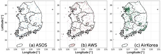 Locations of (a) ASOS, (b) AWS, and (c) AirKorea observation sites in South Korea.