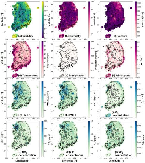 IDW was adopted as the spatial interpolation model in this study. IDW has been used extensively in environmental studies [31,32,33,34]. IDW, which is a basic geostatistical process, is based on two assumptions: (1) The values of spatially adjacent points are similar owing to the common location factor and (2) The similarity decreases as the distance between the two points increases. IDW uses the weight between the observation point and the point to be estimated. In IDW interpolation, the power parameter (P), which is the exponent of the distance, indicates the significance of the surrounding points on the interpolated value. The typical value of P is 2 [33,34]. In this study, we attempted to determine appropriate P values for each parameter (the visibility, and meteorological and environmental input variables) by considering the distribution of the ground-based observations and pixel size. The P value for the visibility (ASOS sites) was set to 2, whereas the P values for the meteorological (AWS) and air pollution (AirKorea) input variables were set to 3. Figure 3 depicts the IDW interpolation results for each variable.