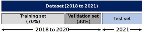 As the causes of low-visibility conditions are diverse owing to the complex geographical features and air pollution levels in South Korea [23,28], machine-learning-based visibility estimation models were constructed in each spatial location (spatial pixel). We used the RF model, which is an ensemble technique based on bagging and randomized node optimization [37]. The RF model averages a large collection of individual decision trees to reduce overfitting. Furthermore, the RF model has built-in feature importance called mean decrease accuracy (MDA) [37,38]. The MDA is a measure of the importance of each input variable, expressing how much accuracy the model loses by excluding each input variable. For each tree, the estimation accuracy using the original dataset was subtracted from that using the input variable permuted dataset, then the remainders were averaged over all trees in the forest, indicating the MDA. The resulting ‘MDA’ was an indicator of input variable importance with regard to its contribution to the estimation accuracy. In this study, we utilized the MDA values to evaluate the regional importance of each input variable in the 2D visibility estimation model (See Section 3.1). We performed the RF model training using the RandomForestRegressor from scikit-learn (version 1.0.2; NumFOCUS, Austin, TX, USA) [39] in Python (version 3.7.11; Python Software Foundation, Wilmington, DE, USA) [40]. The module includes various state-of-the-art machine-learning-based algorithms [39,41]. The RandomForestRegressor includes several hyperparameters, such as n_estimators (the number of trees in the forest) and max_features (the number of variables). The optimal hyperparameters should be selected for improved model performance [37,42]. We used the GridSearchCV function that is available from scikit-learn (version 1.0.2; NumFOCUS, Austin, TX, USA) to determine the optimal hyperparameters. The RF models in each spatial location were trained by optimizing the best hyperparameters. We randomly divided part of the collected dataset (2018 to 2020) into training (70%) and validation (30%) sets to construct the visibility estimation model (Figure 4). The dataset that was collected in 2021 was used as the test dataset, which was subsequently used to evaluate the performance of the visibility estimation model, as described in the following section.