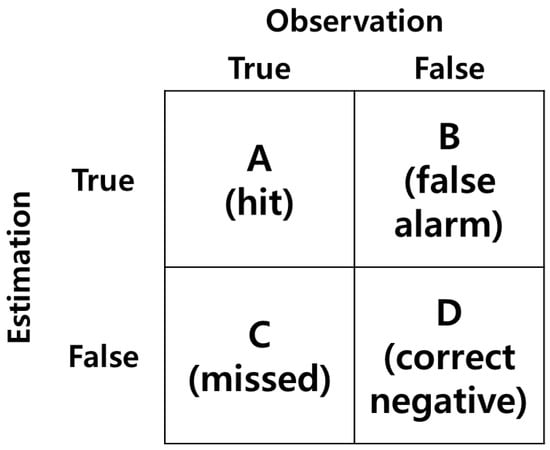 In the above, A indicates a hit (corresponds to true positive), B is a false alarm (corresponds to false negative), C is a miss (corresponds to false positive), and D is a correct negative value (true negative), as illustrated in Figure 5. Recall indicates the ratio of the number of hits to the number of observed visibilities for each range. Precision is the ratio of the number of hits to the number of estimated visibilities for each range. F1 score is the harmonic mean of the precision and recall. The values of the recall, precision, and F1 score are 1 for the perfect model (for worst model, these values are at 0) [49].