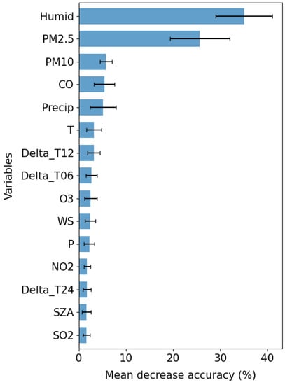 Spatially averaged variable importance (mean decrease accuracy) of visibility estimation model. The error bar indicates the standard deviations.