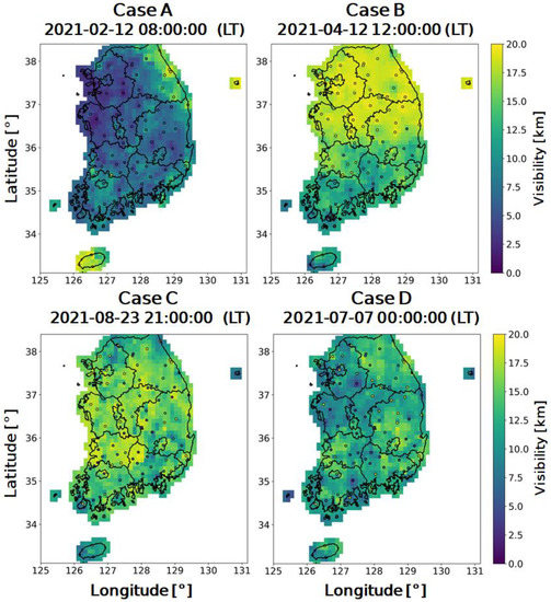 In this study, spatial distributions of the estimated visibility values were investigated for four case studies including two well-estimated cases (Case A: 12:00 local time (LT) on 12 February 2021; Case B: 08:00 LT on 12 April 2021) and two wrongly-estimated cases (Case C: 21:00 LT on 23 August 2021; Case D: 00:00 LT on 7 July 2021). Figure 7 illustrates the spatial distributions of estimated visibility values using the constructed model on each location with 10 km pixel size for the cases A–D. The observed visibilities from the ASOS sites were also plotted to compare the estimated and observed values (Figure 7). As shown in the Figure 7, visibility values had various spatial distributions in South Korea.