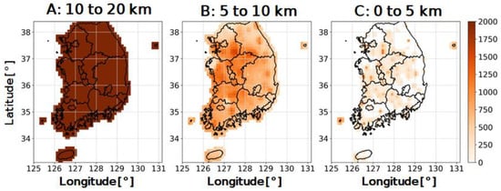 The spatial interpolation was carried out considering the Korean peninsula (longitude: 125.0° to 131.16°; latitude: 33.1° to 38.5°; only land pixels). The pixel size was determined based on the distance between a specific ASOS site and the nearest ASOS site thereto. As indicated in Table 2, the distances ranged from 0.05° to 1.8°, with an average value of 0.28°. In total, 30% (73%) of the ASOS sites were within 0.2° (0.3°) of the adjacent ASOS site. If the pixel size was set to 20 km, the visibility information of two or more ASOS observation points within 20 km could be located, and it was possible that the visibility values of the points would not be sufficiently reflected. A pixel size of 5 km was considered to be too fine because the distance between the observation points was approximately 0.2°. Thus, the pixel size was determined as 10 km.